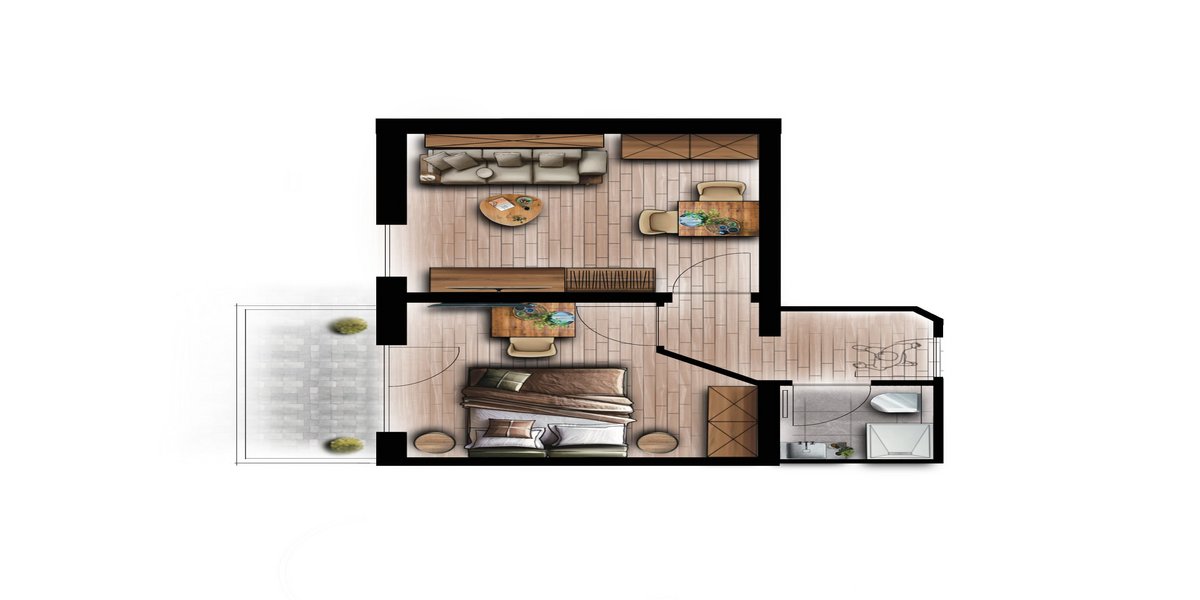 - Living room with wall bed for 2 people (180x200, high-quality mattress)